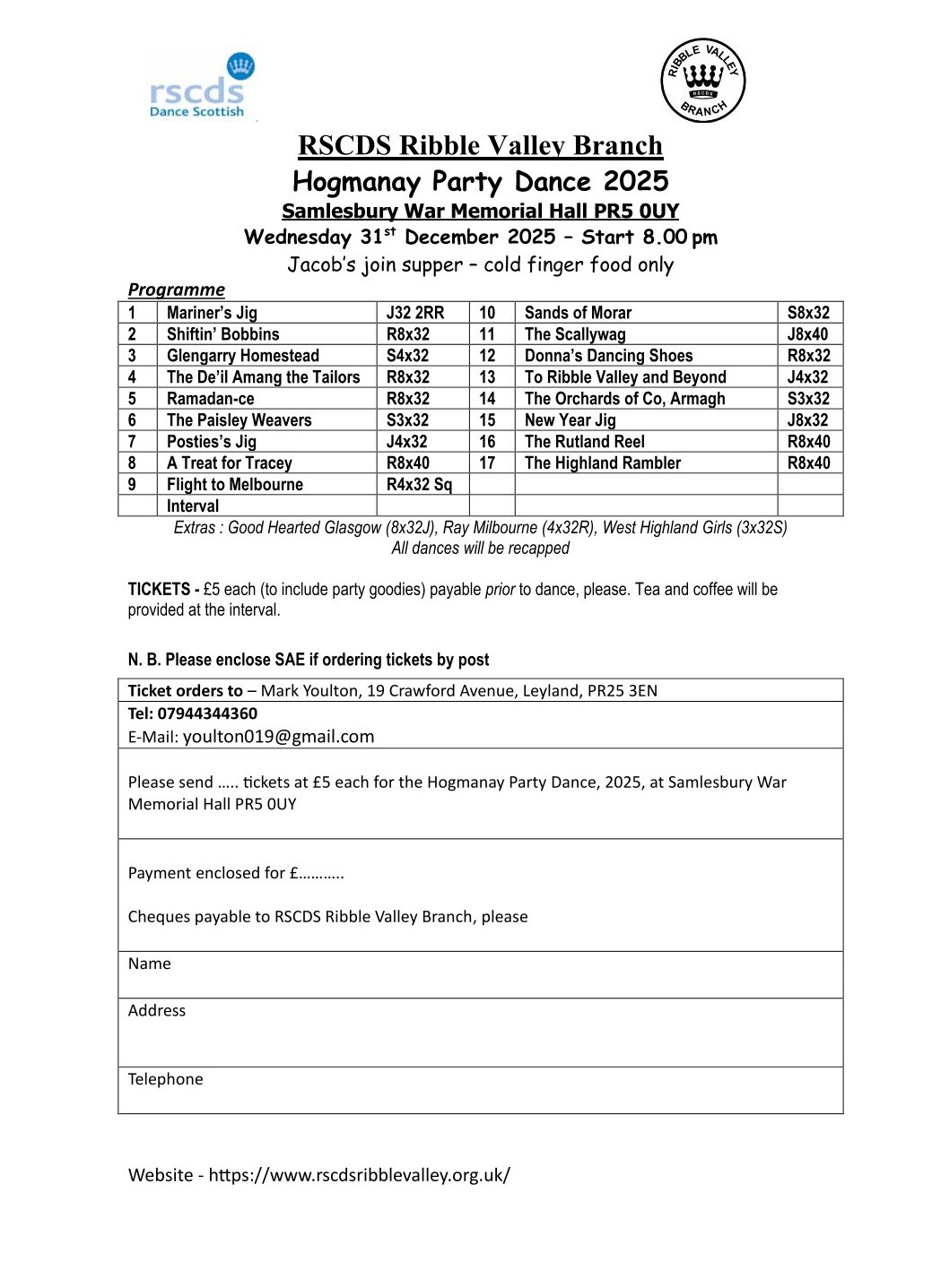 « All Events RSCDS Ribble Valley – Hogmanay Dance Wednesday 31st December 2025 @ 8:00 pm « Autumn Dance 2025 Marian Anderson RSCDS Ribble Valley – Nice & Easy Dance » Cribs & Videos Click Here 👆 Add to calendar Google Calendar iCalendar Outlook 365 Outlook Live Details Date: Wednesday 31st December 2025 Time: 8:00 pm Event Category: Branch Events Venue Samlesbury War Memorial Hall Cuerdale Lane, Samlesbury Preston, PR5 0UY + Google Map